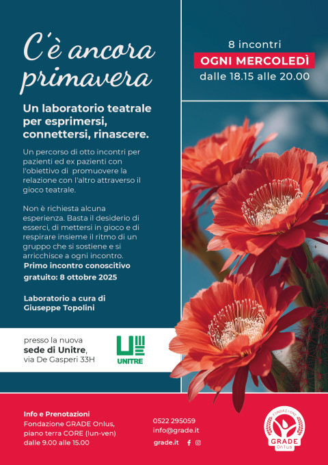 Una meritoria iniziativa viene proposta in collaborazione dalla Fondazione Grade Onlus e dalla UniTre – Università della terza età. “C’è ancora primavera” è il titolo del laboratorio teatrale per esprimersi, connettersi e rinascere. Un percorso di otto incontri per pazienti ed ex pazienti del Core, che ha l’obiettivo di promuovere la relazione con l’altro attraverso il gioco teatrale. Non è richiesta alcuna esperienza. Basta esserci e volersi mettere in gioco e respirare insieme il ritmo di un gruppo che si sostiene e si arricchisce a ogni incontro.