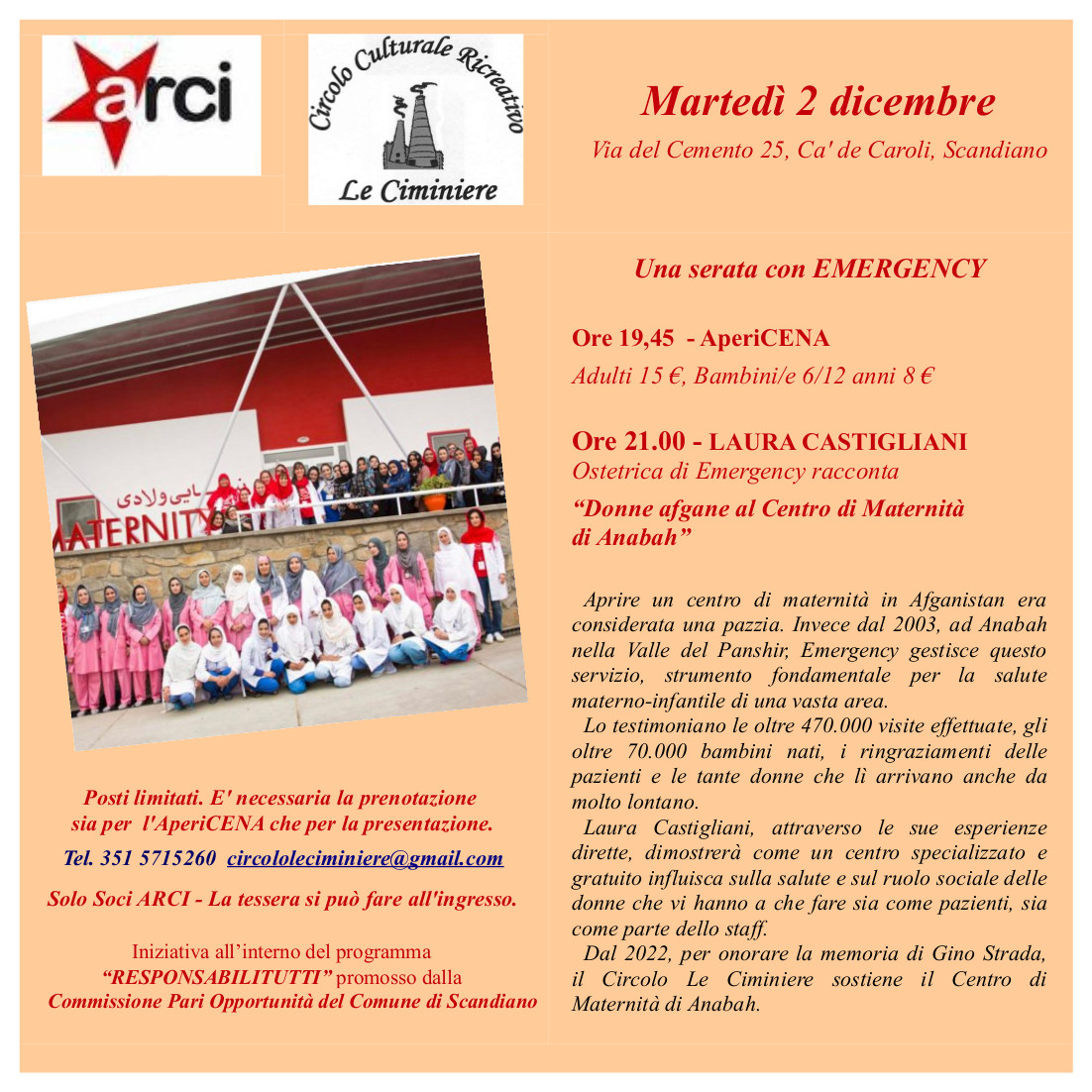 Si parte alle 19.45 con una cena ad aperitivo, con buffet, dal costo di 15 euro a persona per gli adulti e di 8 euro per i bimbi dai 6 i 12 anni. Alle 21 arriverà il momento principale, l’incontro con Laura Castigliani, ostetrica di Emergency che racconterà delle “Donne afgane al Centro di Maternità di Anabah”, una bellissima storia di solidarietà internazionale.