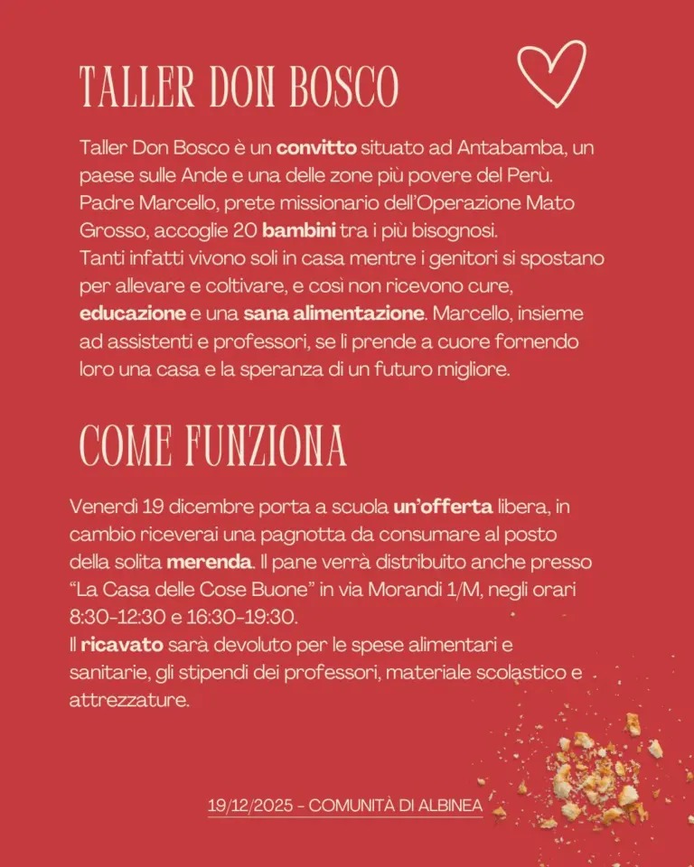 Venerdì 19 dicembre, al posto della merenda, i genitori potranno consegnare ai figli che frequentano le scuole dell’infanzia, primarie e secondarie di Albinea, un’offerta libera da destinare al Taller Don Bosco, un convitto situato ad Antabamba. In cambio dell’offerta tutti gli alunni riceveranno una pagnotta, che sarà consumata con acqua all’intervallo: un piccolo gesto pensando a bambini e ragazzi lontani che si trovano a dover fare i conti con la necessità di ricevere alimentazione, educazione e cure mediche. Ecco in cosa consiste l’iniziativa “Il pane della solidarietà”, promossa dal Comune di Albinea, dal Comitato Pace, gemellaggi e cooperazione internazionale, dall’associazione Albinea Live e da Casa Betania.