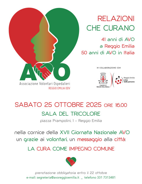 In occasione della XVII Giornata Nazionale AVO, l’Associazione Volontari Ospedalieri (AVO) di Reggio Emilia ODV invita la cittadinanza a partecipare all’evento celebrativo che si terrà sabato 25 ottobre 2025, dalle 16 alle 18 alla Sala del Tricolore del Comune di Reggio Emilia, in piazza Prampolini 1.